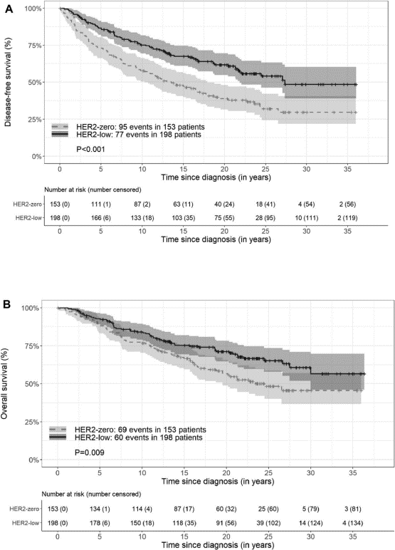 在351例HER2阴性患者中,198例(56.4%)为HER2-low组,153例(43.6%)为HER2-0组。HER2-0和HER2-low组间存在显著差异,具体为病理分级(P=0.001),Ki-67(P=0.013)和HER2基因表达(P=0.002)。HER2-low患者有更长的无病生存期(DFS)(15年DFS率:67.5%[95%CI 61.0-74.7]vs.47.3%[95%CI 39.9-56.1],P<0.001)和更长的总生存期(OS)(15年OS率:75.4%[95%CI 69.4–81.9] vs. 66.8%[95%CI 59.5-74.9],P=0.009)。在激素受体(HR)阳性中观察到OS差异(P=0.039),而在HR阴性没有差异(P=0.086)。多变量分析证实了HER2状态的独立预后意义(DFS:HR,0.546; 95%CI,0.402-0.743; P<0.001; OS:HR,0.653; 95%CI,0.458-0.932; P=0.019) 。