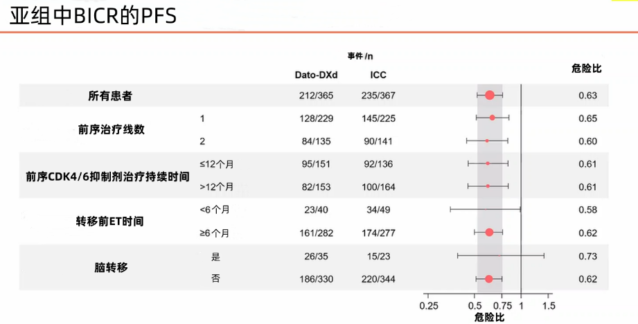 亚组分析显示,在转移后前序治疗线数(1线vs 2线)、前序CDK4/6抑制剂治疗持续时间(≤12个月vs>12个月)、转移前ET时间(<6个月vs≥6个月)、脑转移(有vs无)等人群中,Dato-DXd组PFS均优于ICC组。(图3)OS数据尚不成熟。