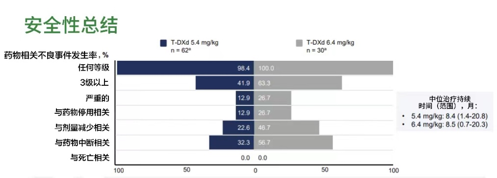 安全性方面,两组≥3级药物相关不良事件的发生率分别为41.9%和63.3%,均未见3级及以上药物相关间质性肺病(ILD)。亚洲人群表现与全人群一致,故同样推荐5.4mg/kg为亚洲患者最佳给药剂量[7](图2)。