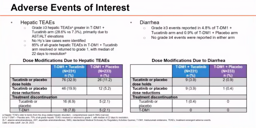 在安全性方面,不良事件类型与之前报告的图卡替尼和T-DM1的不良事件类型一致。由于图卡替尼是靶向HER2的小分子口服络氨酸激酶抑制剂(TKI),而T-DM1是抗体偶联药物(ADC),因此两组之间的不良事件之间没有明显的重叠。T-DM1+图卡替尼组相比单药组,在恶心、腹泻、疲劳、呕吐、肝转氨酶升高的发生率有所增加,但这些通常可以通过停药和剂量减少来管理和逆转。总体上,这项研究的结果是令人满意的。