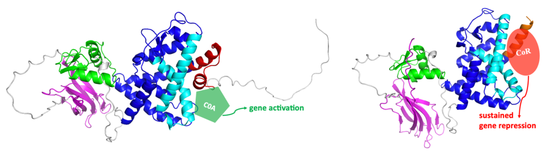 RARG外显子10编码其LBD-H11_12。LBD-H11_12在RARG响应ATRA作用时的变构反应中发挥关键作用,导致LBD与共抑制因子(CoR)解离并转而与共活化因子(CoA)结合,从而在ATRA作用下由抑制基因转录转换为活化基因转录。蛋白构象分析显示这种新形式的RARG三段式融合RARG-LBD-H11_12截短,因此丧失对生理和药理浓度ATRA反应的变构能力(图),成为导致APL发病和对ATRA治疗无反应的关键分子机制。体外细胞实验中也进一步验证了有完整RARG-LBD的融合蛋白对ATRA反应良好,而发生了LBD-H11_12截短的融合蛋白完全丧失了对生理和药理浓度ATRA的反应性。