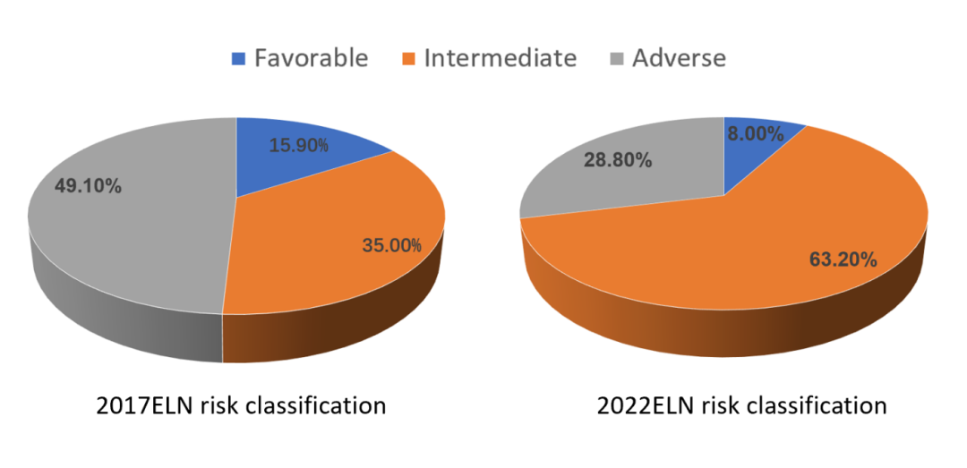 背景:2022年欧洲白血病(ELN)诊疗指南对AML预后分层进行了重要更新。AML合并FLT3-ITD突变被划分为预后中等组,而不再考虑FLT3-ITD等位基因比率或者是否合并NPM1基因突变,这主要是基于FLT3-ITD等位基因比率检测方法的改进、FLT3抑制剂的广泛使用以及MRD检测对治疗方案选择的指导等。