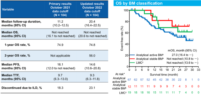 ROSET-BM研究[10]一项多中心、回顾性病例研究,评估了伴脑转移/脑膜转移HER2阳性乳腺癌使用T-DXd的治疗效果。本次SABCS对该研究OS数据予以更新。研究纳入日本62家中心104例经局部治疗或未经治的稳定性脑转移患者、有症状脑转移患者、脑膜转移患者予以分析,中位治疗线序为4线(3-7线),30.8%为有症状脑转移,16.3%为活动性脑转移伴脑膜转移,1.9%为脑膜转移。最新更新的中位随访20.4个月数据显示,mOS未达到(20.6-NE个月),1年OS率为74.8%,2年OS率为56.0%,其中活动性脑转移mOS为27.0个月,稳定性脑转移mOS未达到(10.8-NE个月),脑膜转移mOS未达到(13.6-NE个月),各亚组患者获益一致。mPFS为14.6个月,中位到治疗失败时间(TTF)为9.3个月。23.1%的患者因ILD治疗中断,其中3级及以上ILD为7例(6.7%),未见ILD相关死亡。