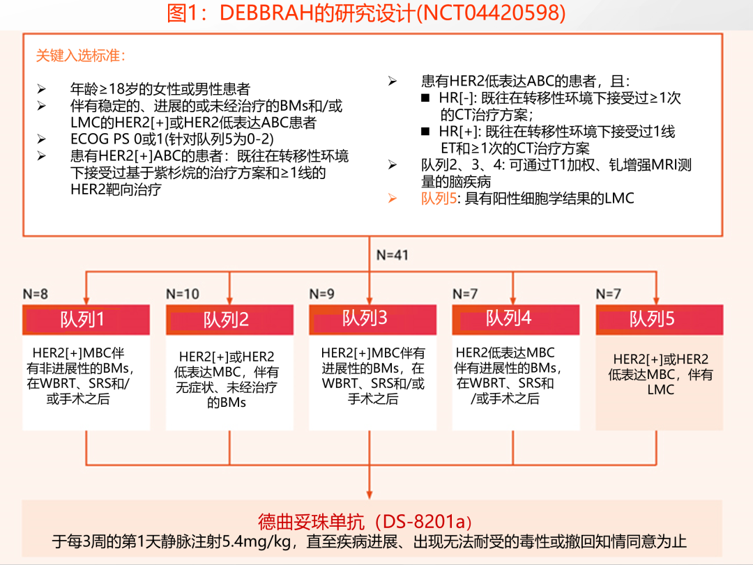 2023年SABCS会议中,ADC药物在HER2阳性乳腺癌脑转移的应用进展为未来带来了更多可能。约有10%的乳腺癌患者会发生脑膜转移[8],我国指南目前仅推荐了鞘内注射,治疗手段极为有限,预后较差。DEBBRAH研究[9]公布了其队列5的研究结果。该研究是一项单臂、开放标签、5个队列的II期研究。对纳入的39例18岁及以上、经过多线治疗的HER2阳性或HER2低表达、稳定或活动性的,初治或经治的BM和/或LMC患者予以德曲妥珠单抗(T-DXd)治疗。队列5则主要针对HER2阳性及HER2低表达晚期乳腺癌脑膜转移患者。