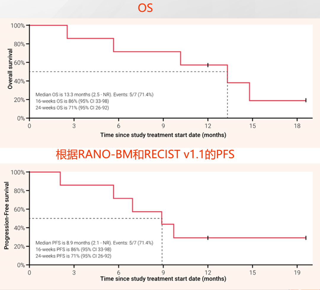 目前队列5共纳入7例患者,中位年龄为57岁(42岁-69岁),3例(42.9%)患者为HER2阳性,既往中位治疗线数为4线(1-8线)。中位随访12个月显示,mOS为13.3个月(95%CI,2.5-NA,P<0.001),达到主要终点;中位无进展生存期(PFS)为8.9个月(95%CI,2.1-NR);2例疾病稳定(SD)超过24周且仍在治疗,其中1例实现完全颅内缓解,5例进展(PD)的患者均非颅内进展。安全性方面常见不良事件(AE)为恶心、疲劳、呕吐等,仅1名患者出现3级治疗相关不良事件(3级恶心),未见间质性肺病(ILD)/肺炎。该队列样本有限,但仍表现出T-DXd对初治HER2阳性和HER2低表达乳腺癌脑膜转移的疗效,且无新的安全信号,值得进一步扩大队列探索验证。