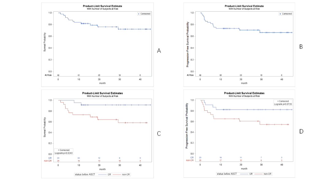 ASCT-CART治疗前CR组和非CR组OS(C)和PFS(D)
