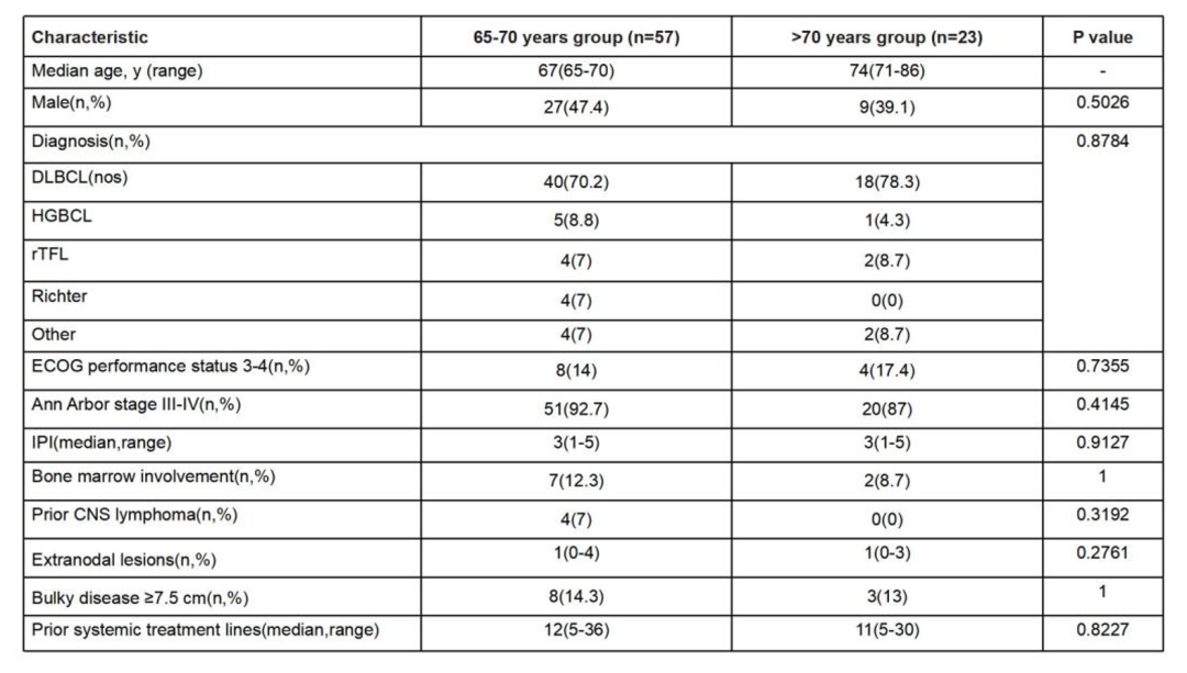 方法:截至2023年4月1日,研究共纳入80例r/r B-NHL患者,并分为年龄65~70岁组(n=57)或年龄>70岁组(n=23)。诊断包括DLBCL NOS(n=58)、HGBCL(n=6)、TFL(n=6)、Richter(n=4)和其他(n=6)。患者基线特征如表1所示。所有患者都接受过重度预处理。71/80(88.75%)患者处于III~IV期。中位IPI评分为3分(范围1~5)。8/96(10%)患者经历过自体造血干细胞移植(HSCT)失败。65~70岁和>70岁组的中位ADL量表评分均为95分。47.5%的患者在CAR-T细胞治疗前接受了桥接治疗(BT)。不同年龄组的基线数据无显著差异。
