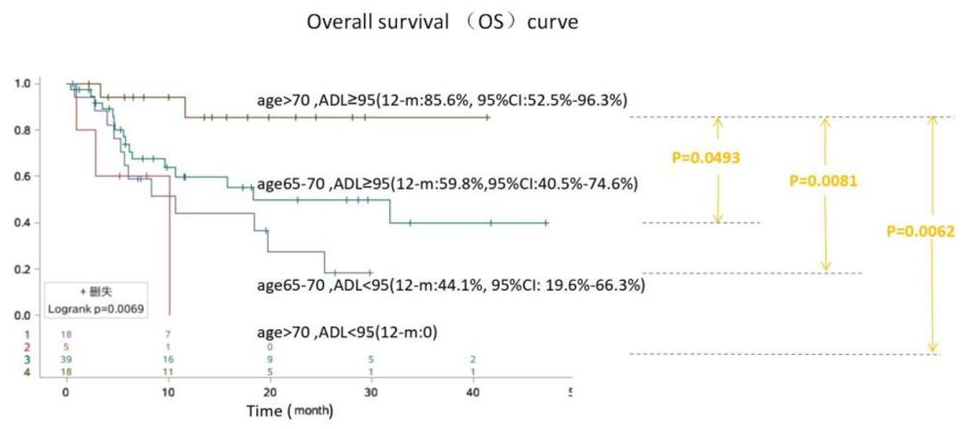 结论:本研究数据表明,CAR-T细胞疗法在70岁以上患者中的安全性和有效性与65~70岁的患者无明显差异。ADL评分低于95分的老年患者接受CAR-T治疗后生存率较低,尤其是70岁以上的患者。不过,目前仍需探索根治性治疗方法以及长期的随访研究。