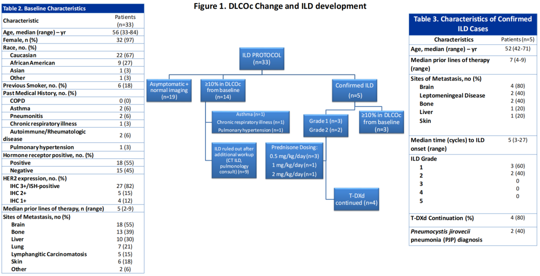 该研究队列中,共有14例患者基线DLCO下降≥10%(其中哮喘、慢性呼吸病、肺高压各1例),最终有5例患者确诊ILD/p,均为1级(3例)或2级(2例)ILD/p。在确诊的5例ILD/p患者中,有3例基线DLCO下降≥10%,另外2例则是有影像学表现;这5例患者经过激素治疗后有4例(80%)能够继续T-DXd治疗。这项研究表明,充分的监测和评估有助于及早发现ILD/p事件,并减少T-DXd的永久停药率。作者认为尽管持续DLCO监测并非适用于所有患者,但是对基线DLCO以及影像学异常的患者,应该进一步通过多学科团队评估。