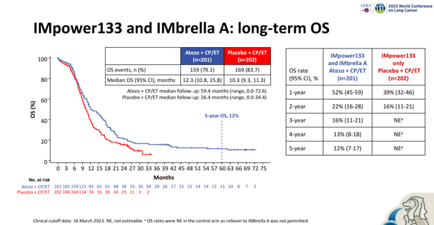 IMfirst是一项在初治ES-SCLC患者中评价卡铂/顺铂+依托泊苷+阿替利珠单抗治疗的Ⅲb期单臂试验。IMfirst研究中ES-SCLC治疗进展(PD)后进行阿替利珠单抗跨线治疗,相较于不接受后续治疗和接受其他治疗,免疫跨线有延长OS趋势,继续ICI治疗未增加不良事件(AE)发生(2023 WCLC. 摘要#P2.14-04)。