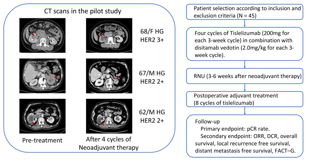 我们发起这项研究的一个重要出发点是,我们认为高危UTUC患者的未来治疗趋势会倾向于新辅助治疗,而非目前证据质量最高的辅助治疗,因为大多数UTUC患者接受肾输尿管全长切除术后,仅剩单侧肾脏,导致对铂类化疗的耐受性和可接受度下降。另一方面,UTUC患者也很容易发生患肾功能下降,无法耐受传统基于铂类的新辅助或辅助化疗,因此本研究采用的毒副作用相对化疗更小的ADC联合ICI,有望使更多患者完成足疗程的新辅助治疗。此外,该研究入组患者并不限制于HER2阳性和PD-L1表达的患者,因为前期的研究显示,整体上大多数UTUC肿瘤存在HER2过表达或PD-L1免疫活性,仅有少部分以携带FGFR2/3突变为主的腔面型乳头状肿瘤。因此,我们也非常期待这项研究的数据提示在不用分子检测的全人群中,PD-1抑制剂联合HER2-ADC能否获得良好的疗效。