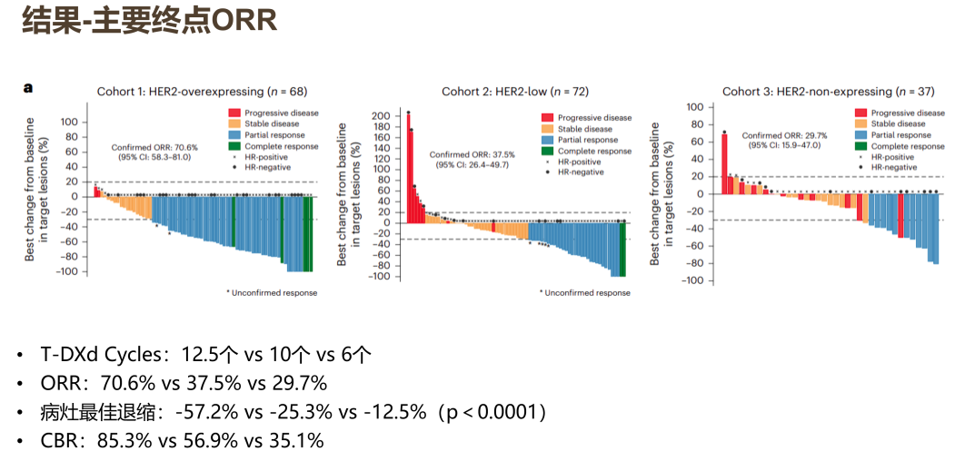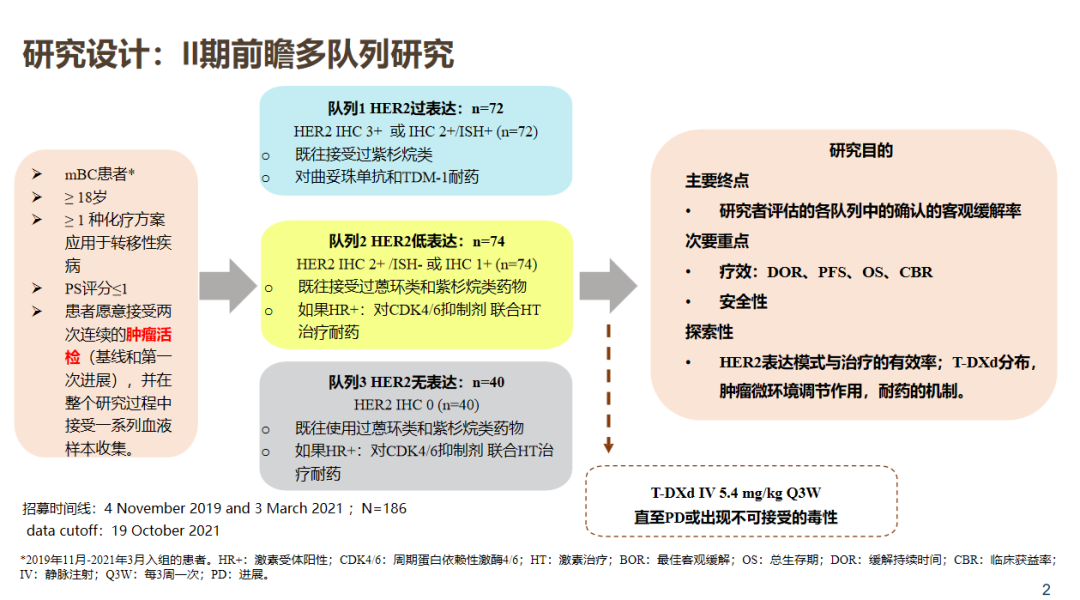 DAISY研究为II期前瞻多队列研究,纳入晚期乳腺癌患者,且患者愿意于基线及第一次进展时接受肿瘤活检,并在整个研究过程中接受血液样本收集。根据HER2的表达水平分为过表达(HER2 IHC 3+或IHC 2+/ISH+,n=72)、低表达(HER2 IHC 2+/ISH-或IHC 1+,n=74)及无表达组(HER2 IHC 0,n=40),研究的主要终点为研究者评估的各队列确认的ORR。