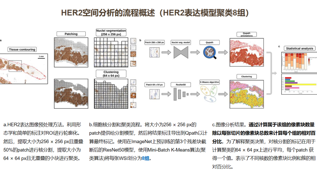 DAISY研究对于HER2免疫组化切片的空间分布特征采用了人工智能予以分析。机器深度学习模型将病理切片分割为像素块(patch),提取二氨基联苯胺(DAB)染色强度、细胞密度两个核心特征,通过ResNet50模型聚类分析将图块分为8类,并进行比例计算。此时每类图块间相似程度最小,描述病理图像特征最佳,能较好的将病理特征与疗效进对照预测。