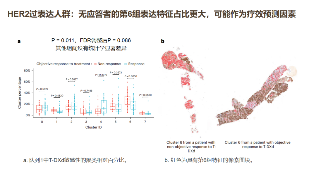 在HER2过表达的8类图块中,以第6类对T-DXd治疗无应答占比更高,其余类别无显著差异,提示符合第6类的特征是不良预后因素,包括:HER2染色强度低(中位OD值0.19)、中等细胞密度(37%的patch无核,34%的patch仅1核),且主要为成纤维细胞和免疫细胞。然而对于HER2低表达样本应用该方法却未能发现预后预测特征,仍需进一步探讨。