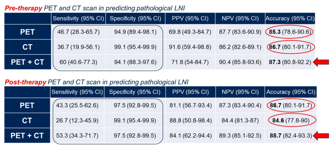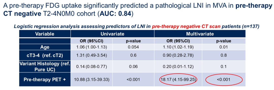 FDG-PET和CT扫描在预测总体患者LNI方面的准确性相似,治疗前(85.3%和86.7%)和治疗后(86.7%、84.6%)均类似;差别是PET预测骶前LNI准确性较低(治疗前和治疗后分别为76.6%vs 88.8%、78.8%vs 86.6%),VH治疗前的PET预测准确性也低于CT(84.3%和90.9%)。治疗前FDG摄取可以显著预测MVA中的病理性LNI情况(OR:17.8,P<0.001,AUC:0.89),与T2-4N0M0队列结果一致(OR:18.17,P<0.001,AUC:0.84)。