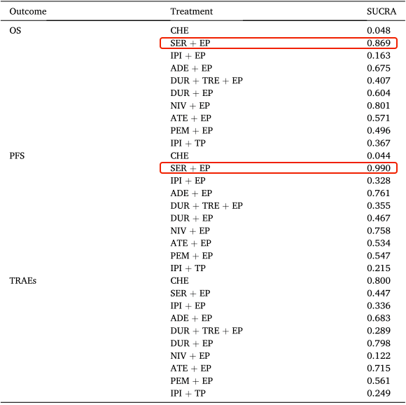 SUCRA评分显示:斯鲁利单抗联合卡铂-依托泊苷OS和PFS的SUCRA评分最高,分别为0.869和0.990,提示斯鲁利单抗联合化疗能为ES-SCLC提供最优的生存获益。