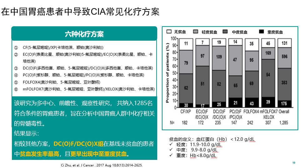 胃癌是我国最常见的恶性肿瘤之一,年新发、死亡患者数均位居全国第三,其中大多数患者发现即为晚期,总体5年生存率不足50%[1,2]。胃癌的治疗与患者的分期、分型密切相关,化疗作为基石治疗手段之一发挥着重要作用,即便选择靶向或免疫治疗,也会联合相应的化疗药物以提升抗肿瘤作用[3]。然而,化疗药物在治疗胃癌的同时,会带来贫血等不良反应。有研究显示胃癌常见的化疗方案CIA发生率为89.8%,中重度CIA的发生率约为43%,其中以DCF/DCX总体贫血发生率最高,接近92%[4]。