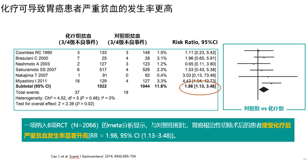 化疗是直接导致胃癌患者发生贫血的原因。研究显示,胃癌患者化疗后较化疗前贫血的发生率提高了近30%[5,6];胃癌根治性切除术后的患者接受化疗较未接受化了者严重贫血发生的相对风险提升1.98倍[RR=1.98,95%CI(1.13–3.48)][5]。
