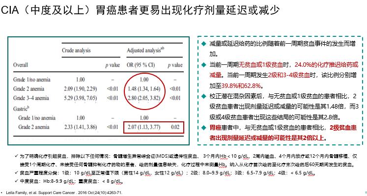 2023年一项针对肿瘤学家和血液科医生的调研显示,近60%的受访者认为CIA对改变癌症治疗策略有临床影响,41%的医生在面临CIA时,会考虑对治疗方案减量或延期,有19%的访谈医生认为,CIA是他们调整肿瘤治疗方案的主要原因之一[11]。与之相呼应的是,在一项纳入3955例多癌种患者的研究中,胃癌相较于NHL、乳腺癌、肺癌、卵巢癌和结直肠癌等因CIA导致的化疗剂量延迟或减量的发生比例最高,约为77.9%。若患者上一周期出现2级及以上贫血,则RDI降低事件的比例会随之升高2-3倍。前一周期无贫血或1级贫血时,24.0%的化疗推迟给药或减量。当前一周期发生2级和3-4级贫血时,这一比例将分别增加至39.8%和62.8%[12]。