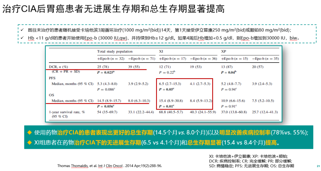 值得注意的是,通过防治CIA,可改善患者生存状况。在对胃癌患者使用卡培他滨+伊立替康(XI)以及卡培他滨+顺铂(XP)方案一线治疗时,若在治疗期间为患者予以EPO-b,则较未处理的患者改善DCR和OS[15]。因此,需在临床中积极防控CIA。