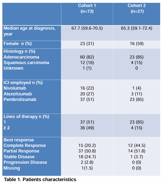 截至2023年12月20日,本研究纳入了两个队列共100例患者。队列1包括73例根据临床选择在24个月后继续ICI治疗的患者,队列2包括27例在24个月时停止ICI治疗的患者。本研究允许对寡进展性NSCLC进行局部治疗。