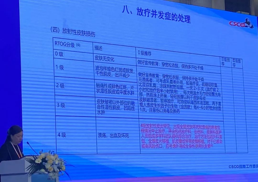 RTOG分级4级:新增Ⅰ级推荐“4级放射性皮炎罕见,出现全层皮肤坏死和溃疡的患者应视情况中止放疗,并由包括放疗科、创伤科、皮肤科医护人员组成多学科团队提供综合治疗,治疗方法包括外科清创、全厚皮片移植、肌皮瓣或带蒂皮瓣移植。对于已感染或有风险伤口,应考虑外用或全身性使用抗生素”。