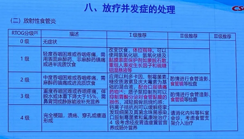 RTOG分级为2、3、4级:新增Ⅰ级推荐“配合口服镇痛药物”、“抑制胃酸分泌对食管粘膜的损伤”。