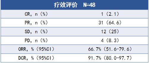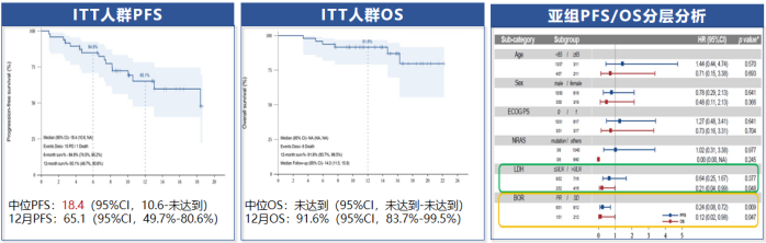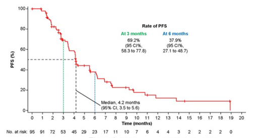 结果显示,ORR为34.7%(95%CI 25.3~45.2);DCR为72.6%(95%CI 62.5~81.3);中位缓解持续时间(DOR)为5.6个月(95%CI 2.9~8.3);中位PFS为4.2个月(95%CI 3.5~5.6)(图5~6)。安全性方面未出现导致死亡的治疗相关不良事件(图7)。此次更新也体现了对特定突变类型患者的个体化治疗策略的重视。