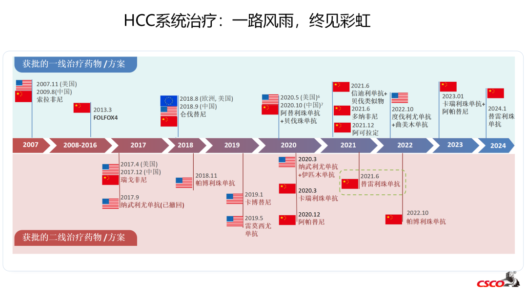 2007年,索拉非尼作为肝细胞癌(HCC)的首个靶向治疗药物在美国获批,成为一线治疗的里程碑。在接下来的十年中,国内批准了FOLFOX4化疗方案作为一线治疗选择。2017年起,肝癌系统治疗领域不断有新药物、新方案涌现,包括仑伐替尼、多纳非尼、阿替利珠单抗联合贝伐珠单抗、信迪利单抗联合贝伐类似物、卡瑞利珠单抗联合阿帕替尼、替雷利珠单抗等多个一线治疗药物/方案,以及瑞戈非尼、帕博利珠单抗、卡博替尼、阿帕替尼、纳武利尤单抗联合伊匹木单抗、雷莫西尤单抗、替雷利珠单抗等二线治疗方案相继获批。这些进展极大地丰富了患者的治疗选择,也突显了精准医疗和个体化治疗策略在提升HCC治疗效果中的关键作用。