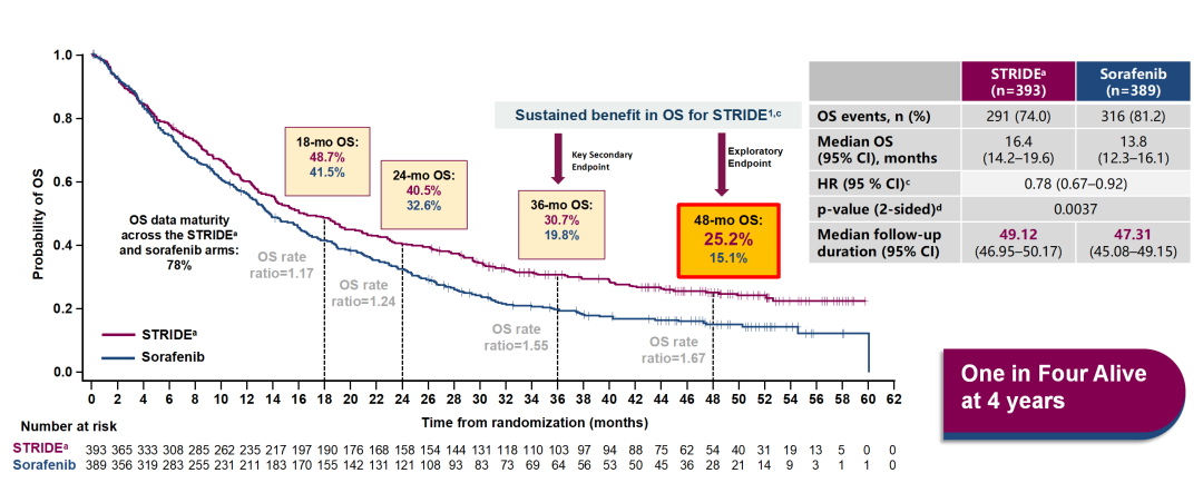 该研究的4年OS数据显示[5],截至2023年1月23日,STRIDE组、度伐利尤单抗组和索拉非尼组的中位随访时间分别为49.12、48.46和47.31个月。STRIDE组的4年OS率仍然较高,为25.2%,而索拉非尼组则为15.1%。
