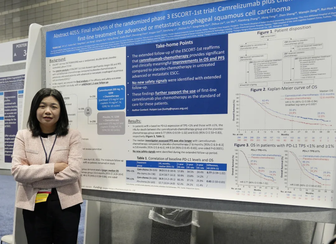 2024年5月31日至6月4日,全球瞩目的ASCO年度盛会在美国芝加哥隆重召开。在科学殿堂的星芒之下,多项重磅研究成果悉数亮相,让今年“From Comfort to Cure”这一主题名至实归。其中,曾在2021年惊艳全球的ESCORT-1st研究也携带最终分析结果登上世界舞台,再一次为全球食管癌领域献上中国科研力量。研究显示,卡瑞利珠单抗+化疗组一线治疗晚期食管鳞癌(ESCC)的中位总生存期(OS)和中位无进展生存期(PFS)均显著优于安慰剂+化疗组,3年总生存率高达25.6%,一举刷新现有一线免疫联合化疗方案的3年长生存数据,且亚组分析揭示,无论PD-L1 TPS的表达水平如何,卡瑞利珠单抗+化疗组一线治疗晚期ESCC均能带来显著长生存获益:相较于安慰剂+化疗组,在PD-L1 TPS<1%的患者中,3年总生存率从14.2%提升到24.4%;在PD-L1 TPS≥1%的患者中,3年总生存率从11.4%跃升至25.9%,并且未观察到新的安全信号[1]。这一突破性成果全面展现了中国方案卡瑞利珠单抗联合化疗的治疗优势,预示着晚期食管癌患者的长生存正逐步成为现实。