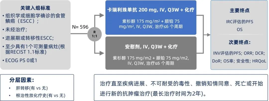 ESCORT-1st研究是由中山大学肿瘤防治中心徐瑞华教授领衔、国内60家中心参与的一项随机、双盲、安慰剂对照III期临床试验,也是全球首个免疫联合TP(紫杉醇+顺铂)一线治疗ESCC的III期研究(研究设计如图1所示)。JAMA Oncology曾发表社论,ESCORT-1st研究是ESCC治疗的关键转折点,也是备受国际关注的新临床证据[2]