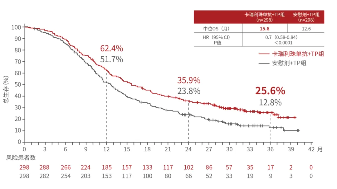 图2.卡瑞利珠单抗+化疗vs安慰剂+化疗在全人群中的生存曲线