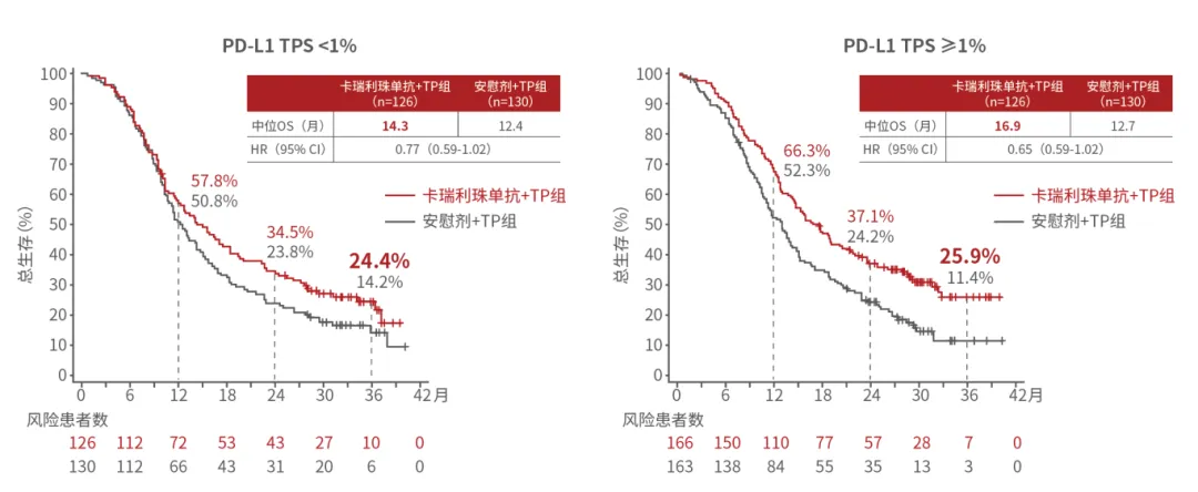 图3.卡瑞利珠单抗+化疗vs安慰剂+化疗在PD-L1 TPS<1%和PD-L1 TPS≥1%患者中的生存曲线