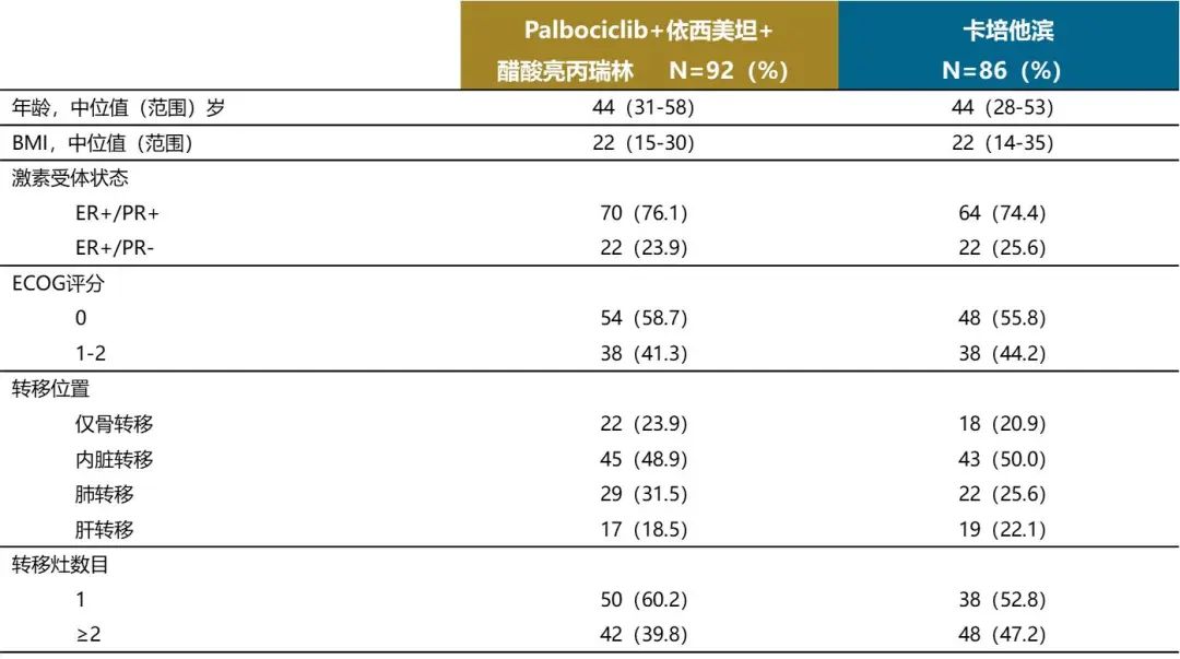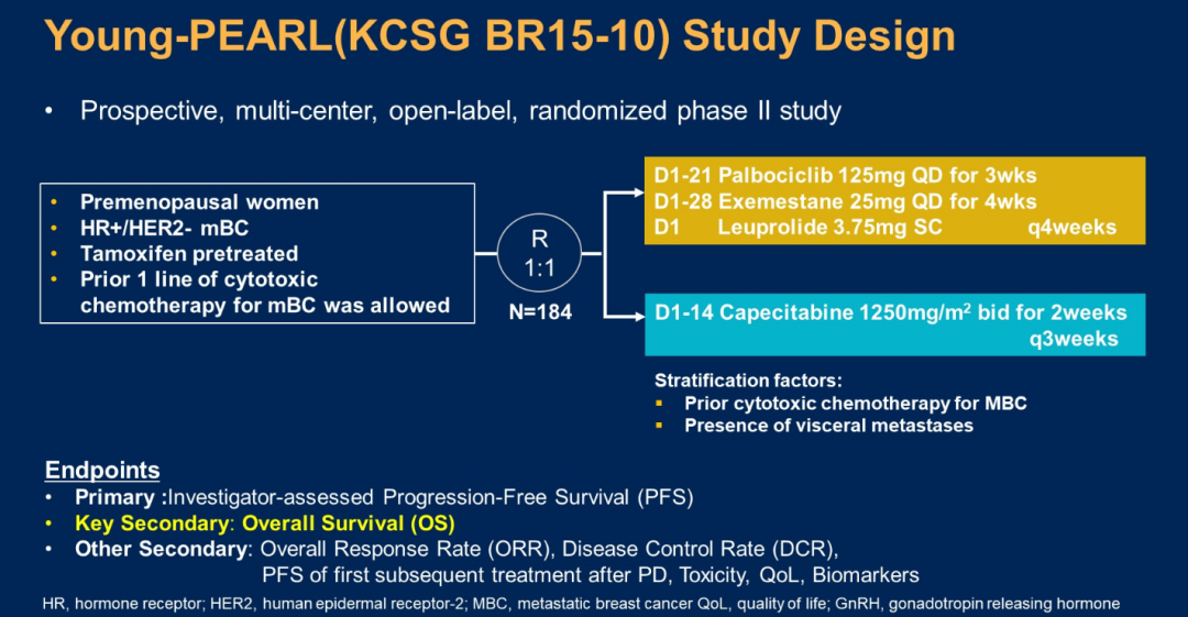 这项前瞻性、多中心、随机的Ⅱ期研究入组了绝经前HR+/HER2-晚期乳腺癌189例,最终纳入分析的患者共计178例。首诊晚期的患者,在入组前必须接受过他莫昔芬治疗。患者随机1:1分配接受CDK4/6抑制剂哌柏西利+依西美坦+亮丙瑞林或卡培他滨。主要终点为研究者评估的PFS;次要终点包括DCR、OS、AE、QoL和生物标志物。