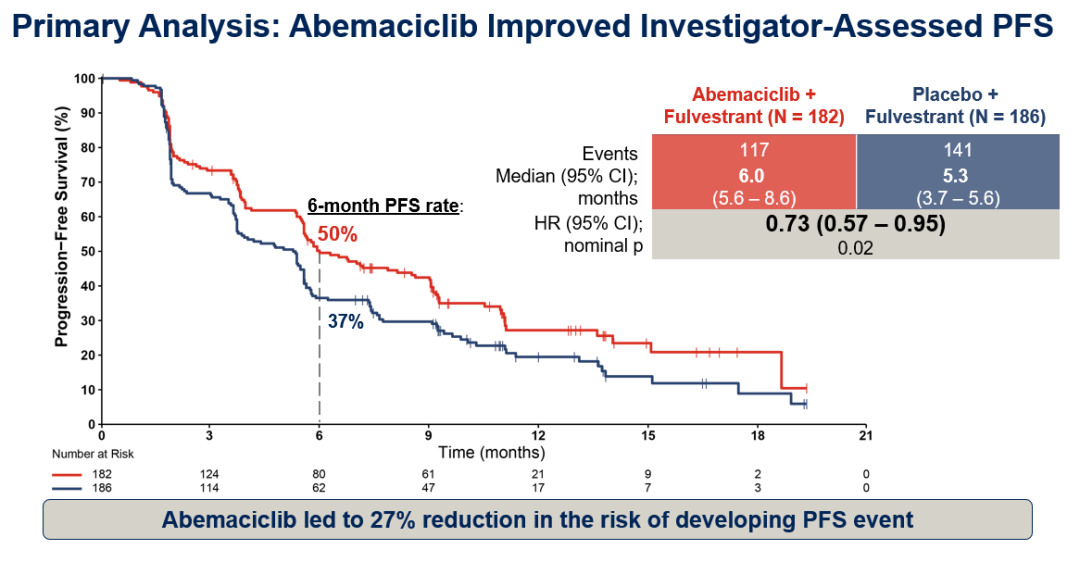 在发生251例PFS事件时进行的主要结果分析(Primary Analysis)显示,阿贝西利改善了HR+、HER2-ABC患者(在先前CDK4/6i+ET治疗中疾病进展)的PFS,发生PFS事件的风险降低27%(HR:0.73,95%CI:0.57-0.95),中位PFS分别为6.0个月vs 5.3个月,结果有统计学意义(P=0.02)。