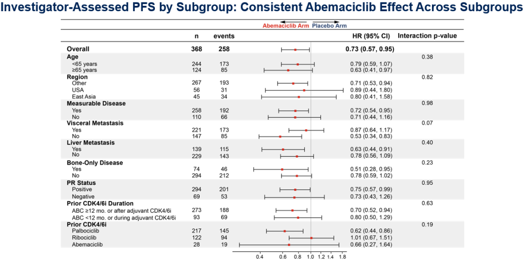 在多个预先指定且临床相关的亚组如年龄、内脏转移亚组、肝转移亚组、骨转移亚组、不同既往CDK4/6i治疗时长(≥12个月或<12个月)、既往应用不同CDK4/6i方面具有一致的获益趋势,交互检验中没有发现不能从阿贝西利跨线治疗中获益的亚组。