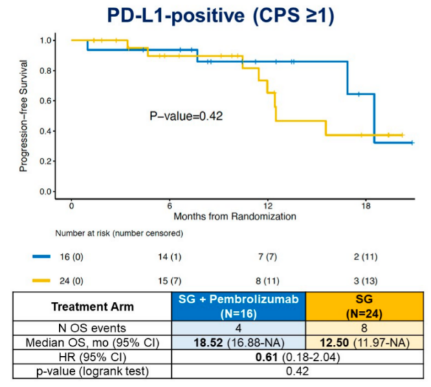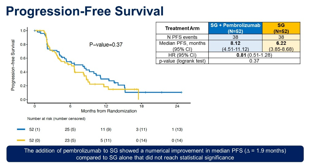 在中位随访12.5个月时,SG联合帕博利珠单抗治疗组的中位PFS为8.12个月,SG单药治疗组为6.22个月,但两组之间的差异未达到统计学显著性(HR 0.81,95%CI:0.51~1.28,P=0.37);ORR分别为21.2%和17.3%;OS数据尚不成熟,迄今只有26例,SG联合帕博利珠单抗治疗组和SG单药治疗组分别为18.52个月和17.96个月(HR 0.65,95%CI:0.33~1.28)。尽管在PD-L1阳性的患者亚组中观察到SG联合帕博利珠单抗治疗组的PFS(11.05 vs 6.68个月)和OS(18.52 vs 12.5个月)有所改善,但这些改善同样未达到统计学显著性。安全性与既往报告一致,未发现新的安全性信号。