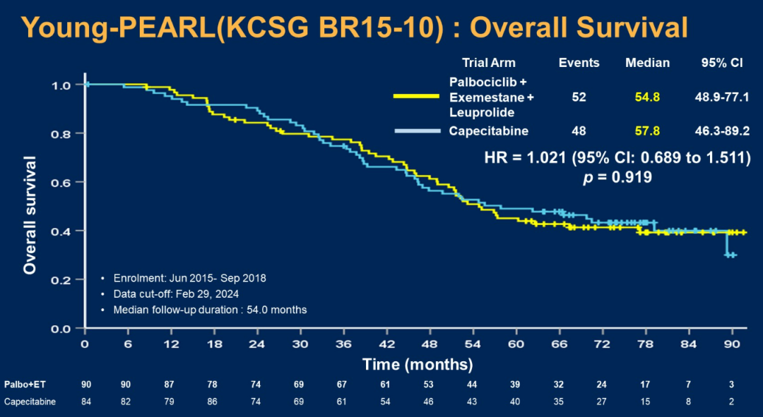 Ⅱ期Young-PEARL(KCSG-BR 15-10)研究在绝经前HR+/HER2-晚期乳腺癌患者中,将哌柏西利联合内分泌治疗与化疗进行对比。研究成果在2019年ASCO年会首次公布了主要研究终点PFS分析结果。2024年ASCO大会上,该研究报道了延长随访至54个月的PFS及OS分析结果,为CDK4/6抑制剂哌柏西利联合内分泌治疗在HR+/HER2-晚期乳腺癌中的应用提供了重要参考价值。