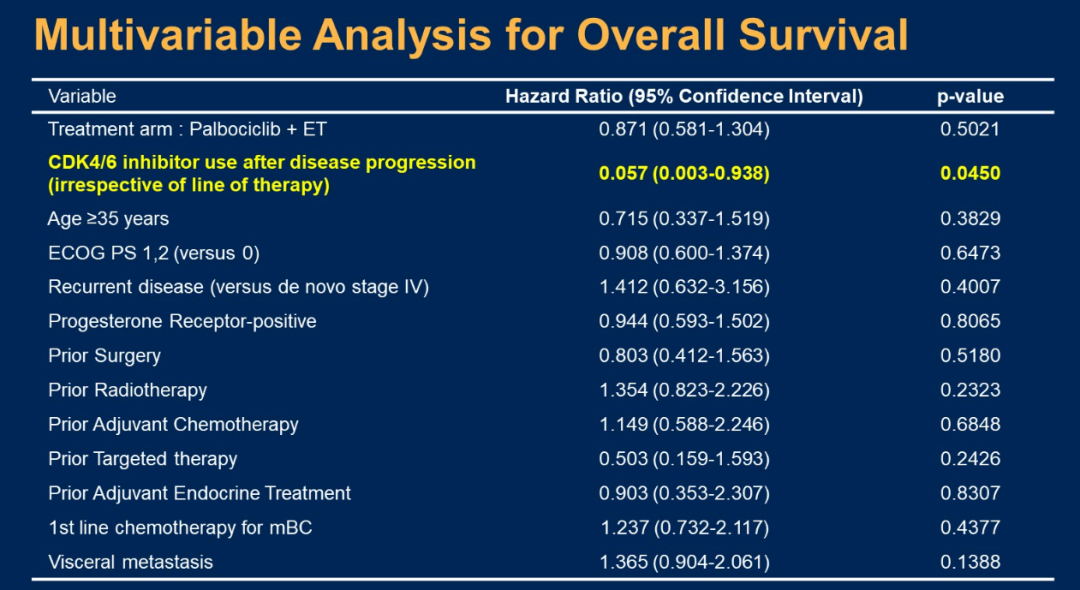 本次ASCO大会首次报道了该研究的OS结果,哌柏西利联合内分泌治疗组的中位OS为54.8月vs 57.8月(HR 1.021,95%CI:0.689~1.511,P=0.919)。各个亚组的OS分析结果趋势与总体人群一致。OS多因素分析结果显示,疾病进展后使用CDK4/6抑制剂可显著降低疾病进展或死亡风险(HR 0.057,95%CI:0.003~0.938)。卡培他滨组后续使用CDK4/6抑制剂的比例26.8%,而哌柏西利联合内分泌治疗组后续CDK4/6抑制剂的比例仅为5.6%。本研究同时对疾病进展后未使用CDK4/6抑制剂治疗的人群进行了OS分析,结果显示这部分患者中,哌柏西利联合内分泌治疗组患者OS数值上优于化疗组:49.0月vs 38.8月(P=0.065),以上两点提示可能后续治疗的疗效会影响患者整个OS的评估结果。