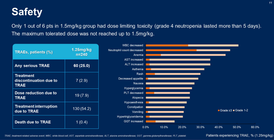 结果显示,截至2024年4月1日,共有260例患者入组,剂量范围为0.33~1.5mg/kg。在1.5mg/kg组中,只有6例患者中的1例出现了剂量限制毒性(4级中性粒细胞减少症持续时间超过5天)。在达到1.5mg/kg时未达到最大耐受剂量,并且出于耐受性考虑,将RP2D(推荐2期剂量)选择为1.25mg/kg。以1.25mg/kg的剂量入组240例患者。1.25mg/kg剂量组最常见的TRAEs(治疗相关不良事件)(≥20%,所有级别/≥5%,≥G3)包括白细胞(WBC)计数减少(50.8%,23.3%)、中性粒细胞计数减少(46.3%,27.9%)、贫血(43.8%,8.3%)、天冬氨酸转氨酶升高(42.1%,2.9%)、丙氨酸转氨酶升高(35.4%,2.1%)、乏力(32.1%,2.9%)、皮疹(30.0%,5.0%)、食欲下降(28.8%,1.3%)、恶心(26.7%,0%)、高血糖(25.4%,2.1%)、血小板计数减少(24.2%,4.6%)、脱发(24.2%,0%)、感觉减退(22.5%,1.7%)、便秘(21.3%,0%)、呕吐(20.9%,1.3%)、高三酰甘油血症(20.4%,2.1%)、γ-谷氨酰转肽酶升高(15.8%,5.4%)。