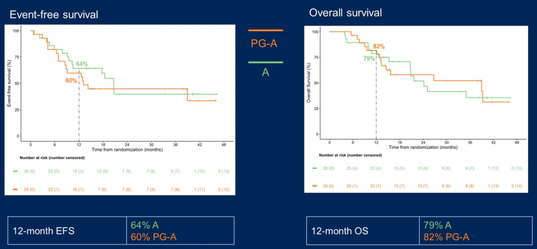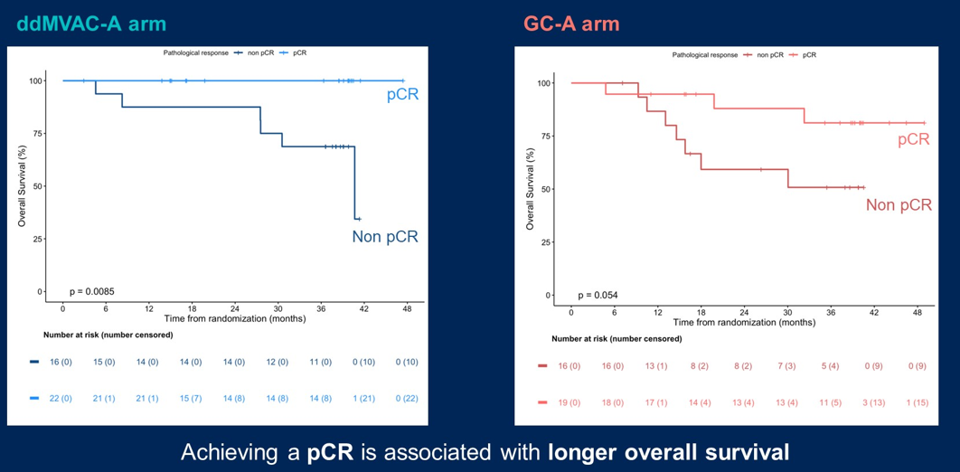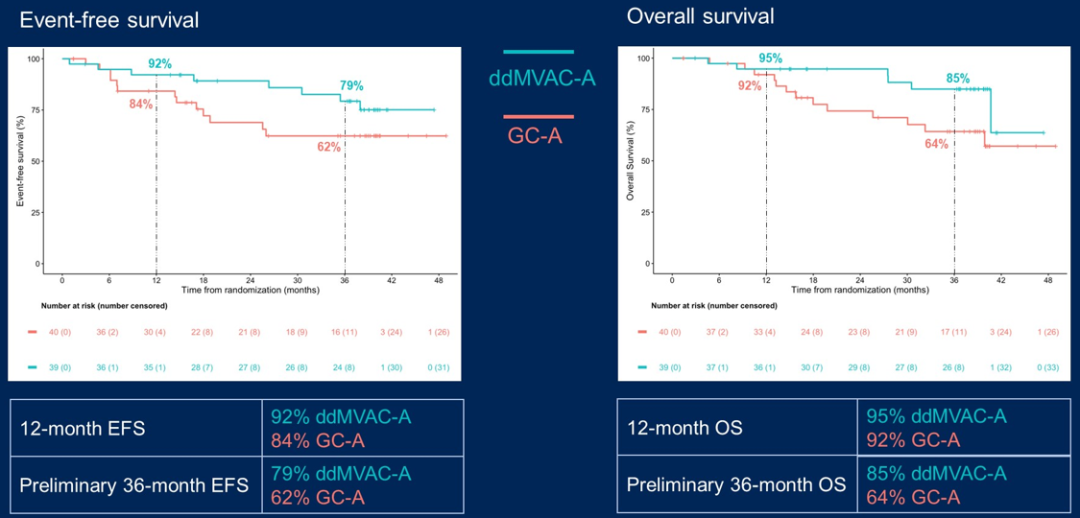 中位随访时间为33个月,共报告了45例死亡。符合顺铂治疗的人群中,ddMVAC联合阿维鲁单抗组的12个月和36个月EFS分别为92%和79%,CG联合阿维鲁单抗组EFS分别为84%和62%。ddMVAC联合阿维鲁单抗组12个月和36个月的OS分别为95%和85%,CG联合阿维鲁单抗组OS分别为92%和64%。在ypT0N0患者中,12个月的随访期内未报告任何事件,两组EFS率为100%;在36个月时,ddMVAC-A治疗组未报告任何事件,而CG-A组有2例。
