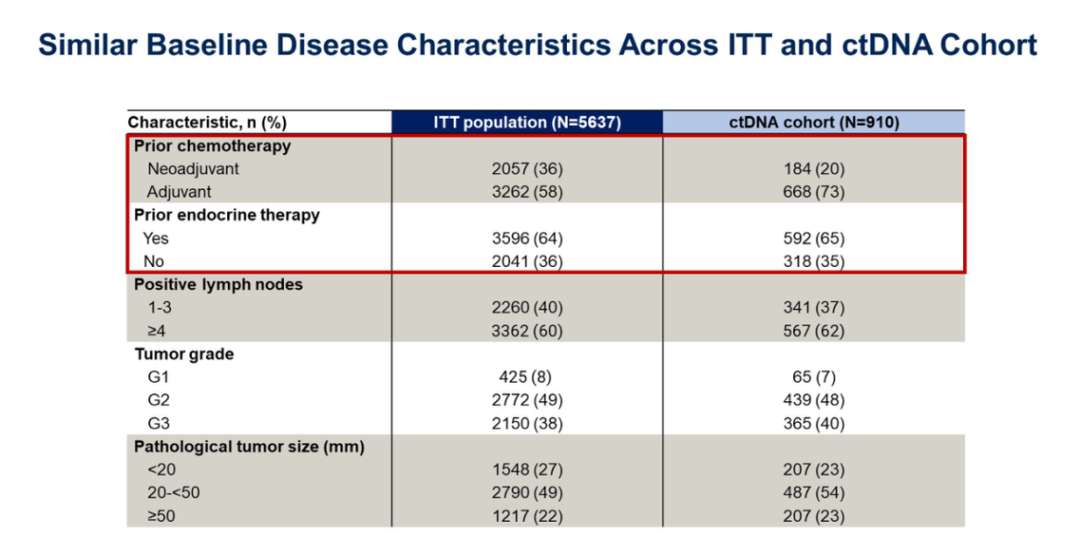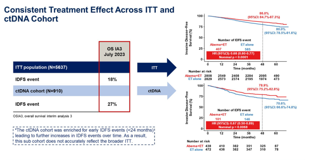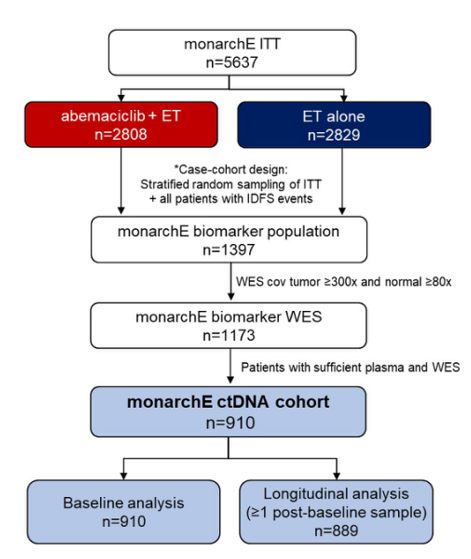 在1397名患者中,65%(n=910)有足够的血浆样本进行了ctDNA检测以及肿瘤组织的WES检测(ctDNA队列)。MonarchE研究ITT人群IDFS事件率为18%,而ctDNA队列由于富集了发生IDFS的人群,其IDFS事件率为27%(阿贝西利+ET组为23%[101/438];ET组为31%[146/472])。