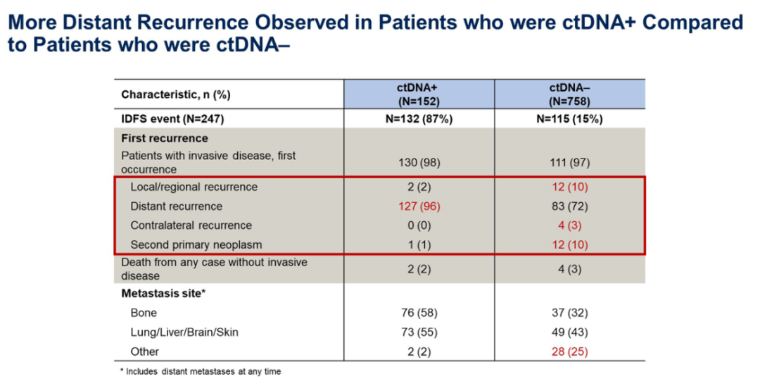 ctDNA队列910名患者中,有83%(758名)的患者在研究期间持续ctDNA状态呈现阴性,该ctDNA阴性人群只有15%发生了IDFS事件。而在ctDNA阳性的患者中,则有87%发生了IDFS事件。由此可见,ctDNA可以识别高危风险患者。