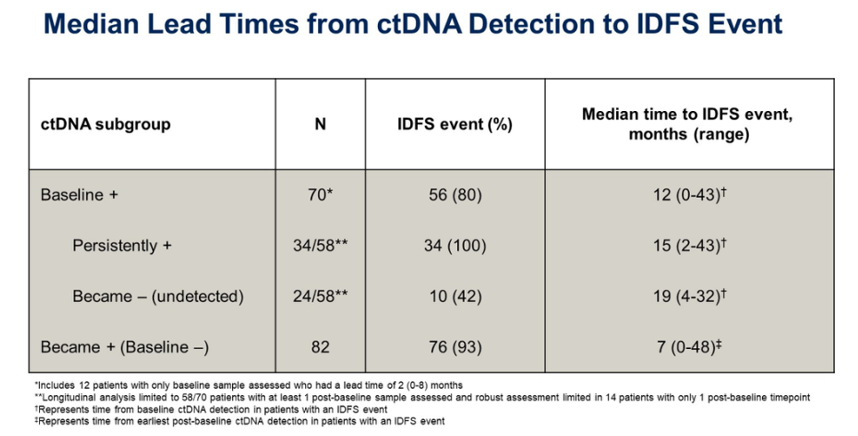 基线状态时有70名(7.7%)患者ctDNA为阳性,其中56例患者(80%)发生了IDFS事件,34例ctDNA持续阳性的患者均发生了IDFS事件,而24例ctDNA转阴的患者中仍有10名(42%)患者发生了IDFS事件,这提示我们,即使患者ctDNA由阳性变成阴性,我们也不能掉以轻心。进一步分析结果提示,82例患者基线状态ctDNA为阴性,但治疗过程中ctDNA呈现阳性,其IDFS事件发生率亦高达93%。在24个月的研究治疗期间,任何时候检测到ctDNA都预示不良预后。