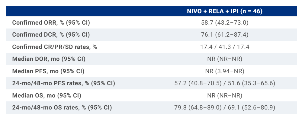 结果显示,在46例患者接受治疗的患者中,中位随访时间为44.1个月,患者中位年龄为61.0岁。8.7%的患者为肢端皮肤黑色素瘤,50.0%为BRAF阳性,73.9%为LAG-3阳性,26.1%为肿瘤细胞PD-L1阳性,6.5%的患者曾接受过辅助治疗。中位治疗持续时间为5.0个月。三联免疫疗法的ORR为58.7%,48个月OS率为69.1%。