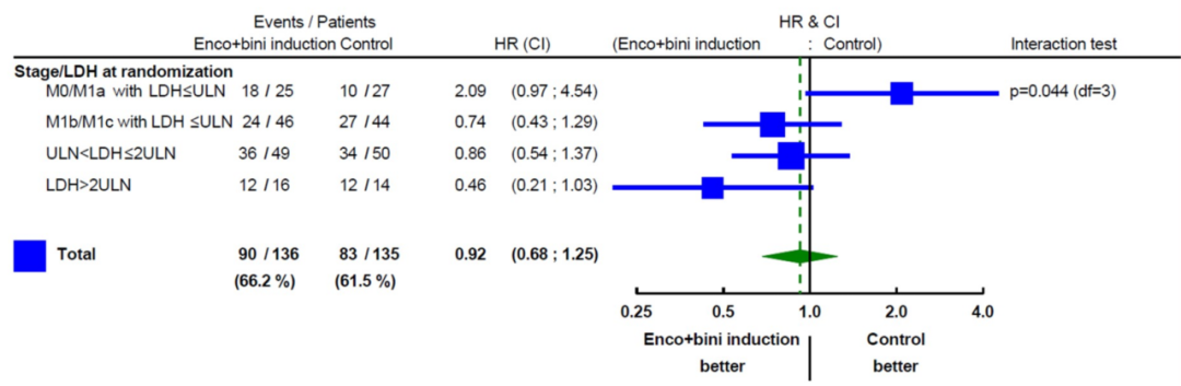 经过中位21个月的随访,结果显示,在意向治疗(ITT)人群中,两种治疗方法在PFS方面没有显著差异(HR 0.87,90%CI:0.67~1.12,P=0.36)。然而,在预设的亚组分析中,对于M0/M1a且LDH≤ULN、M1b/M1c且LDH≤ULN、ULN<LDH≤2ULN和LDH>2ULN的Ⅲ期患者,B组vs.A组的HR分别为2.09(95%CI:0.97~4.54)、0.74(95%CI:0.43~1.29)、0.86(95%CI:0.54~1.37)和0.46(95%CI:0.21~1.03)(交互作用P=0.044)。对于LDH高水平患者,序贯治疗组的PFS表现出获益的趋势。