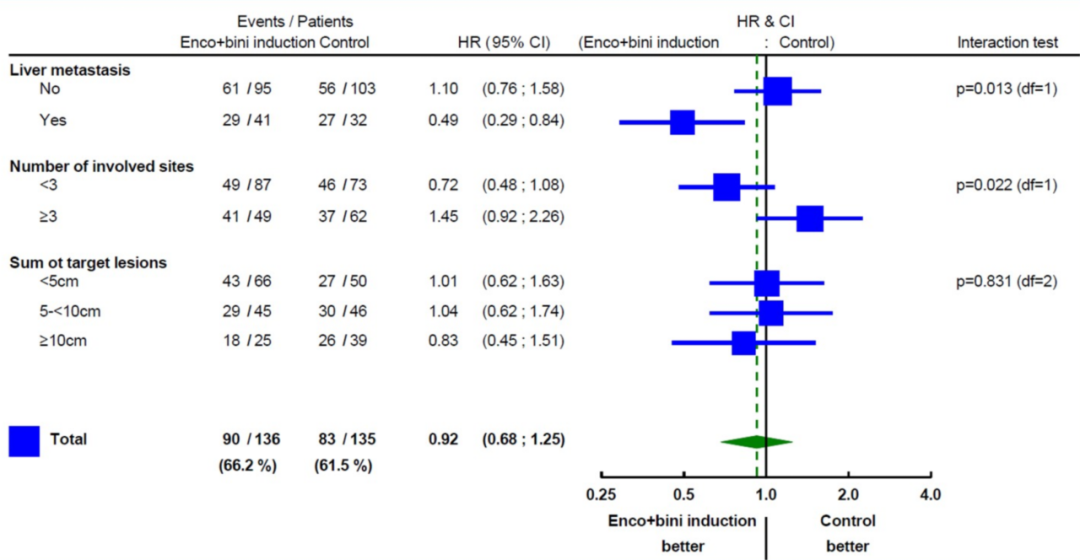 同时,在事后亚组分析中,存在肝转移的患者,治疗HR为0.49(95%CI:0.29~0.84,交互作用P=0.013)。序贯治疗组肝转移患者同样表现出PFS获益趋势。