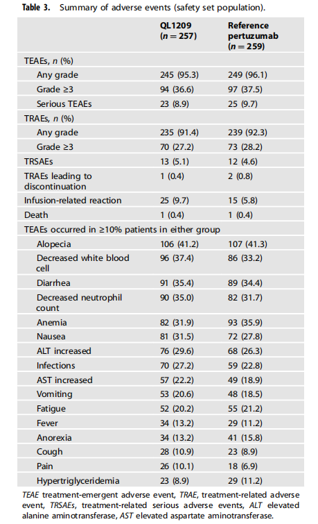 在安全性方面,QL1209同样展现出与原研药高度相似的安全性。QL1209试验组与原研药对照组治疗中出现的不良事件(TEAEs)发生率分别为95.3%及96.1%,3级以上TEAEs发生率分别为36.6%和37.5%。最常见的治疗相关不良事件(TRAEs)为脱发、腹泻、白细胞计数减少及贫血,且两组患者TRAEs发生率相似,表明QL1209安全性与原研药相当。
