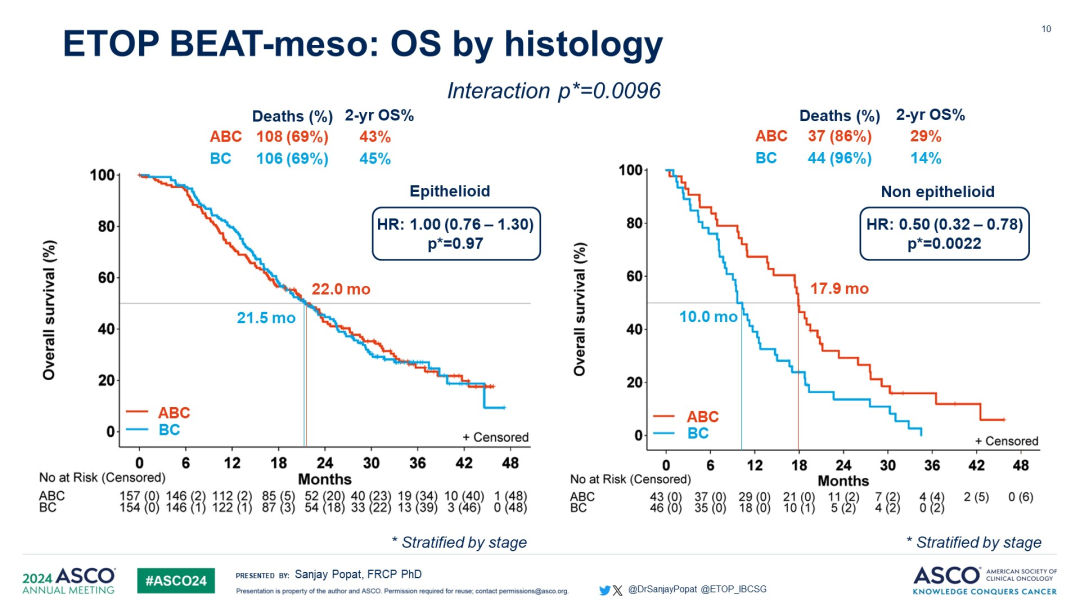 Dr.Popat:BEAT-meso(ETOP13-18)试验是一项针对不可切除的胸膜间皮瘤患者的随机III期试验,评估了阿替利珠单抗联合化疗加贝伐珠单抗(ABC)是否优于最佳对照组的化疗加贝伐珠单抗。ABC方案是有效的,但不幸的是,整体方案没有达到预先设定的OS主要终点,生存优势并不具有统计学意义。然而,这可能是由于间皮瘤有两种主要组织学类型——上皮样亚型和非上皮样亚型。